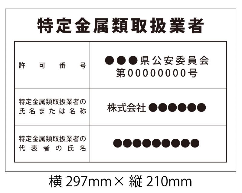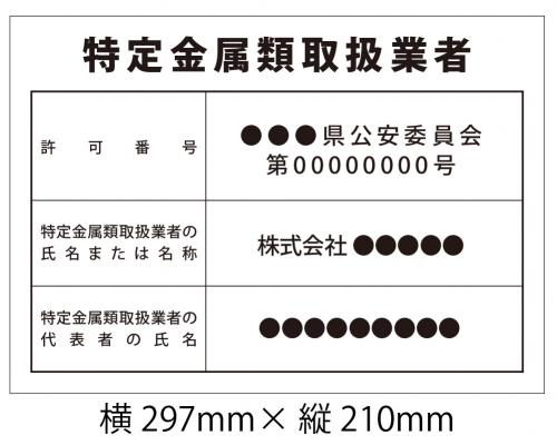 特定金属類取扱業者の表示看板です。297mm×210mmのサイズです。フォントはゴシック系を使用しています。